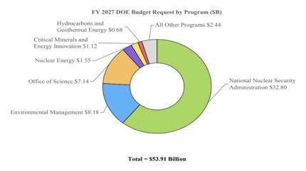 While the US White House has requested $53.9bn for the Department of Energy (DOE) for FY 2027, almost 10% up on 2026. The bulk of this – $32.8bn – is allocated to the National Nuclear Security Administration, a 12% increase from 2026. The proposal also includes $1.2bn to support seven AI supercomputers at the Argonne and Oak Ridge National Laboratories. Other DOE department, however, see funding reductions. Congress must review and vote on the budget before it is finalised.